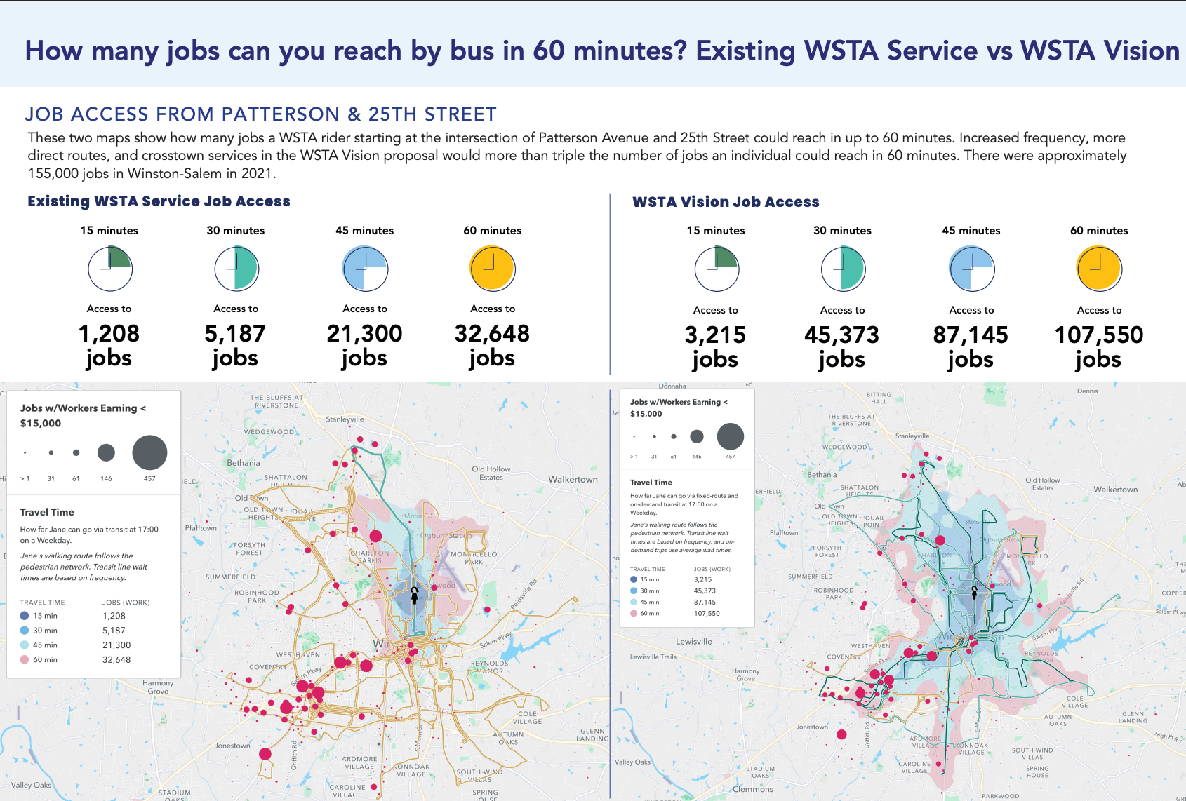 The proposed shift could be a significant benefit to Winston-Salem. The yellow lines in the existing WSTA Service job access map show that the current bus route can cover about the same area as the proposed framework within 60 minutes. However, the new framework is much more efficient, allowing people to travel along the covered routes in less than 60 minutes, giving them more time to walk to additional employment opportunities. This increase in fast coverage drastically expands the number of work opportunities that can be reached in the same time intervals.